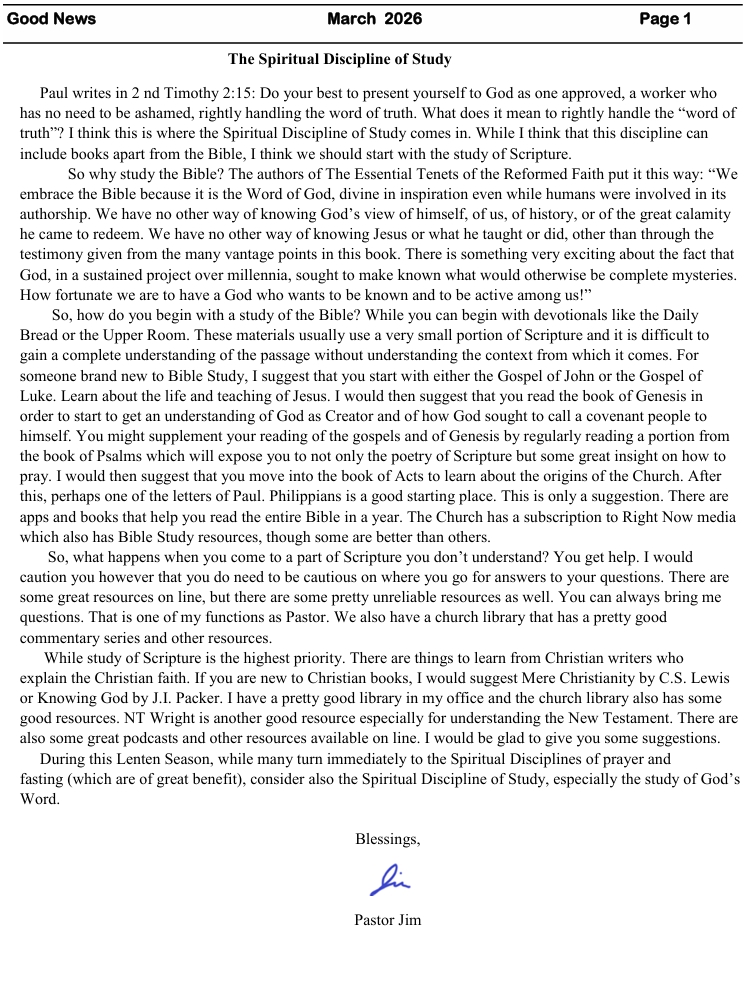 Sunday WOrship - 9:30 sunday school 10:40 Fellowship hour 10:40